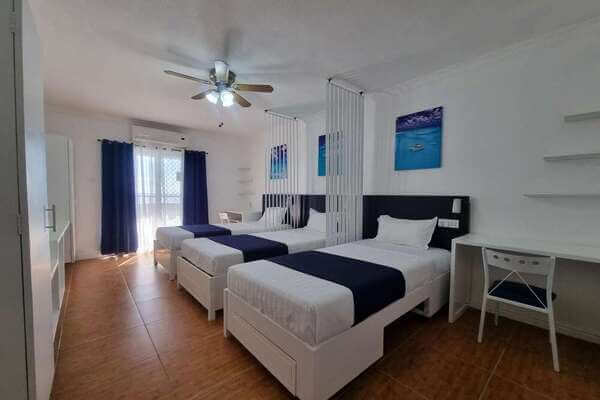 フィリピンの学校のほとんどは校舎内または近隣の寮を提供しておりますが、Cebu Blue Oceanでは敷地内のホテル滞在が可能です。お部屋タイプは1人部屋から3人部屋まで選んでいただけます。2人部屋と3人部屋ではオーシャンビューでセブの美しいビーチを一望することもできますので、毎日海を眺めて生活をされたい方にはお勧めです。1人部屋は全てシティービューとなっております。各部屋には冷蔵庫、トイレ・シャワールーム、クローゼット、エアコン、デスク、椅子を完備しているので快適に過ごしていただけます。敷地内には飲み物、お菓子、カップ麺やアイスなどが購入できる売店や授業後に寛げるプールサイドBARもあります。しっかりと就学をしながらもリゾート気分を味わうことができる魅力的な滞在先です。